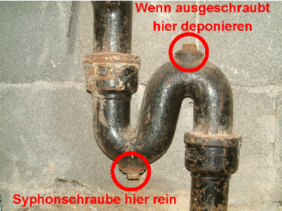 Wenn Boiler leer: Im Keller Syphonschraube ausschrauben und auf Syphonschlaufe deponieren